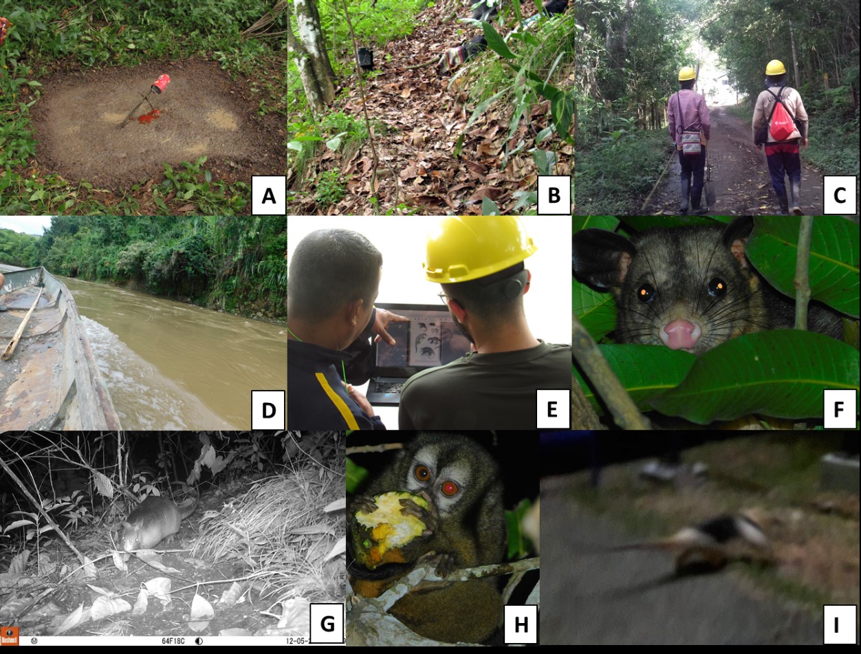 FIGURA 2. Muestreo de mamíferos en el Bosque Seco Tropical Hernán Victoria Mena: trampas huella (A), fototrampeo en presuntos pasos de fauna (B), recorridos terrestres y fluviales (C y D) y entrevistas (E). Registros de algunas especies en el área de estudio: Didelphis marsupialis – Chucha común (F), Dasypus novemcinctus – Gurre (G), Aotus lemurinus – Marteja (H), Tamandua mexicana - Hormiguero, observado por los funcionarios del predio (I).