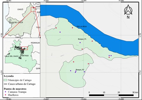 El objetivo de este trabajo fue caracterizar los mamíferos medianos no voladores en el predio denominado “Bosque seco tropical Hernán Victoria Mena”, perteneciente a las Empresas Municipales de Cartago E.S.P (lat 4,75365, long -75,89435 WGS84). Está localizado en el extremo nororiental del casco urbano del municipio de Cartago (Valle del Cauca), adyacente al cauce del río La Vieja con una altitud de 940 msnm (Figura 1). De acuerdo con el Plan de Ordenamiento Territorial, el predio se encuentra en la categoría de “suelos de protección” y parte de sus bosques constituyen área forestal protectora del río La Vieja (Municipio de Cartago 2019).