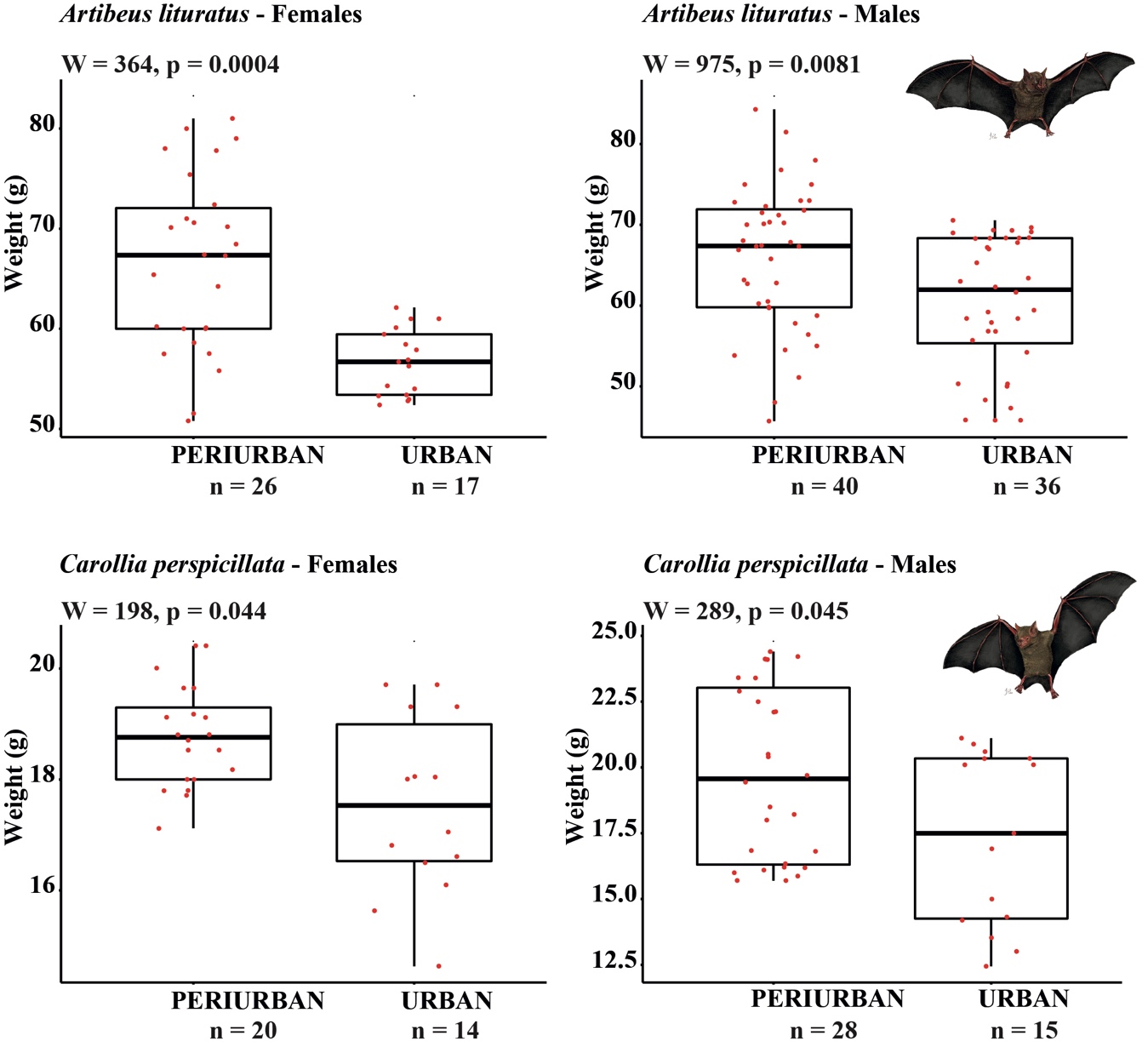 Bats are recognized for their ability to respond to ecological changes as a result of their trophic diversity (Jiménez & Mantilla 2008; Klingbeil & Willig 2009), making them a vitally important group in the regulation and regeneration of ecosystems, seed dispersal, pest control and pollination (Molina & Eguiarte 2003; Bumrungsri et al. 2008; Bumrungsri et al. 2009). Due to the high adaptability of many species to environmental change (Medellín et al. 2000), bats are an interesting group to evaluate how different individuals from the same species respond to environmental gradients. Several studies have demonstrated that bats are sensitive to changes in the environment and as a consequence exhibit changes in reproduction, ecology, and development (Soriano & Ochoa, 2001; Galindo-González 2007; Sherwin et al. 2013; Meyer et al. 2016). These differences vary geographically as the environmental conditions and distribution of resources in transformed landscapes can induce phenotypic differences in wing shape, body, and cranial size, in addition to changes in their behavior (Pérez-Torres & Ahumada, 2004; Mena 2010; Aguirre & Barquez 2013; Meyer et al. 2016). Here, we evaluate how the body mass of two species of fruit bats, Artibeus lituratus and Carollia perspicillata, varies in two fragments of tropical dry forest (TDF) located in an urban and a peri-urban area.