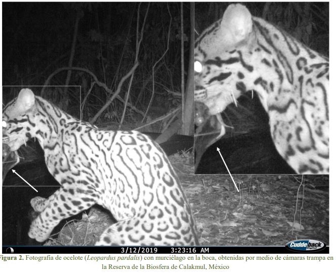 El ocelote enfrenta problemas de conservación a lo largo de su distribución, debido principalmente a la caza ilegal y transformación del hábitat. Se ha documentado que la dieta del ocelote consiste principalmente de pequeños mamíferos terrestres nocturnos, especialmente roedores , aunque también se ha registrado que pueden alimentarse de zarigüeyas, ardillas, conejos, primates, iguanas, ranas, aves, peces, insectos y cangrejos terrestres. La presente nota resulta relevante sobre el comportamiento alimentario de los ocelotes en Mexico debido a que se describe un evento fotográfico de un ocelote alimentándose de un murciélago, el registro fue obtenido con trampas cámara colocadas en la zona nucleo sur de la Reserva de la Biosfera de Calakmul . Estas camaras fueron instaladas para registrar que especies de fauna visitan a los bebederos ariticiales (fuentes de agua abastecidas constantemente por miembros del proyecto) que fueron colocados como parte de un proyecto piloto en los años 2018 y 2019 y tienen como objetivo el abastecimiento de agua en la RBC para uso de la fauna silvestre. Cómo resultado de este esfuerzo, se obtuvo el presente registro fotográfico de un individuo de ocelote alimentandose de un murcielago asociado a un bebedero artificial.