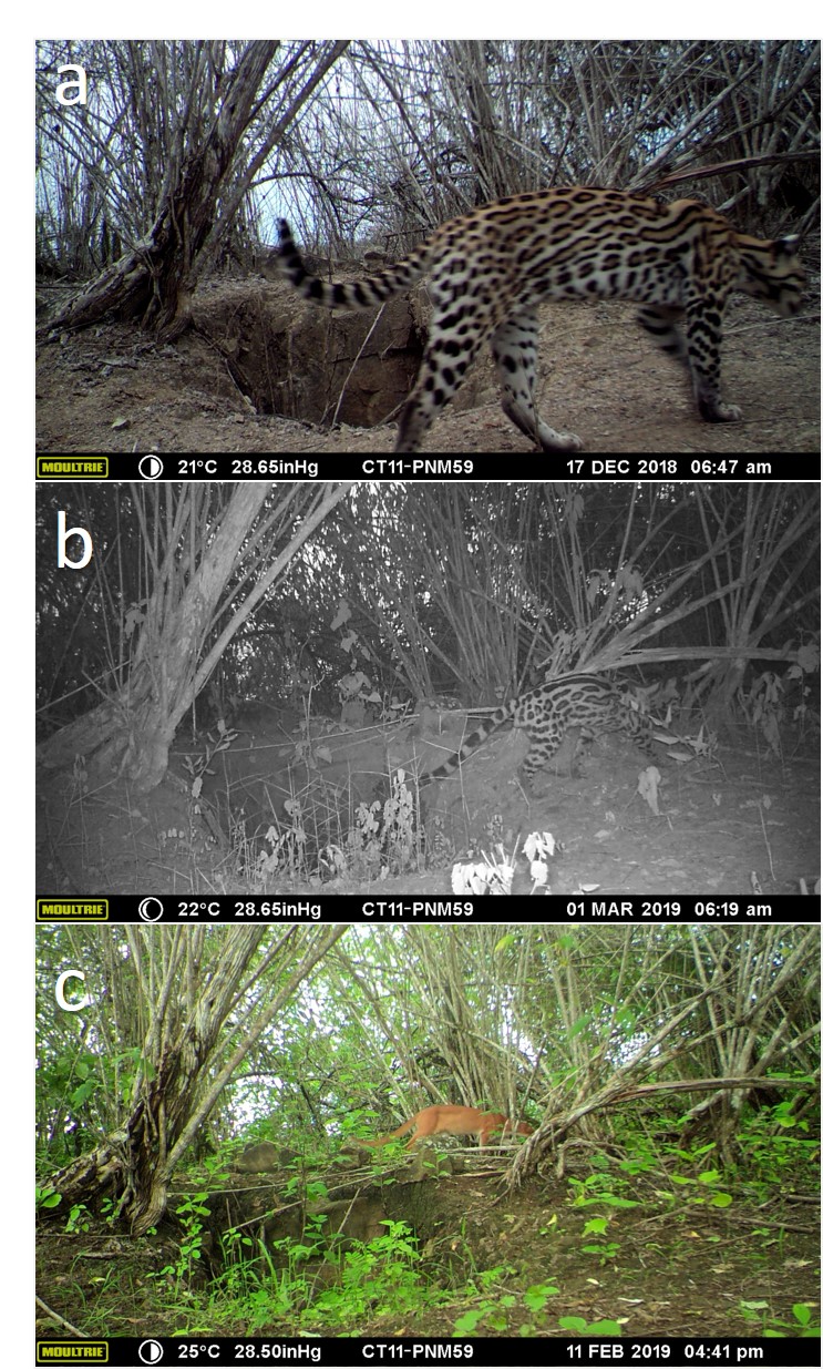 El Parque Nacional Machalilla (PNM) ubicado en el hotspot Tumbes-Chocó-Magdalena al oeste de Ecuador, contiene altos niveles de biodiversidad y endemismo; sin embargo, presenta una constante pérdida y degradación de su hábitat debido a la actividad antrópica. En este trabajo se determinó la presencia de los felinos silvestres dentro del área protegida del PNM. Se ubicaron 60 cámaras trampa dentro de las 56. 184 ha de la zona terrestre del PNM, entre los meses de octubre 2018 y febrero de 2019. Durante este periodo se detectó la presencia de tres especies de felinos silvestres: ocelote (Leopardus pardalis), margay (Leopardus wiedii) y yaguarundí (Herpailurus yagouaroundi). En esta nota se presenta un caso en particular en el que se reportó la presencia de las tres especies de felinos coincidiendo en una de las cámaras trampa