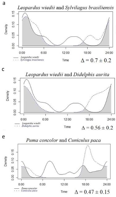 El tiempo y el espacio son dimensiones de nicho que permiten la coexistencia de depredadores y sus presas. Los patrones de actividad son un componente crucial de la ecología y el comportamiento de los mamíferos, y la evitación temporal a menudo se considera el mecanismo más importante de coexistencia entre especies. Sin embargo, la superposición temporal por sí sola no define la vulnerabilidad de la presa o la preferencia del depredador, ya que también debe haber segregación espacial, lo que puede aliviar posibles interacciones hostiles entre animales. En este estudio, probamos si existen diferencias entre los patrones de actividad temporal y espacial de los depredadores (Leopardus wiedii y Puma concolor) y las presas (Sylvilagus brasiliensis, Cuniculus paca y Didelphis aurita). Usamos los datos de las cámaras trampa para probar si la especie del depredador tuvo menos ocurrencia de lo esperado por casualidad en el Parque Nacional da Serra dos Órgãos (PARNASO), un área protegida del Bosque Atlántico brasileño. Usamos una medida de segregación espacial (puntuación C) y una función de densidad del núcleo para determinar el tiempo de actividad de los depredadores y las presas y si un par de especies ocurrieron simultáneamente. Además, calculamos un coeficiente de superposición entre depredadores y presas. Encontramos valores bajos de C-Score en todos los análisis, lo que significa una alta co-ocurrencia espacial y falta de segregación espacial entre los depredadores y sus presas potenciales. Además, la función de densidad del núcleo mostró que los depredadores tenían más actividad catemeral mientras que las presas eran principalmente nocturnas. Mostramos así que la segregación temporal es más importante que la segregación espacial en el área de estudio. Nuestros resultados sugieren que es más probable que los depredadores ajusten sus patrones de actividad en función del comportamiento de su presa principal en lugar de evitar la competencia.