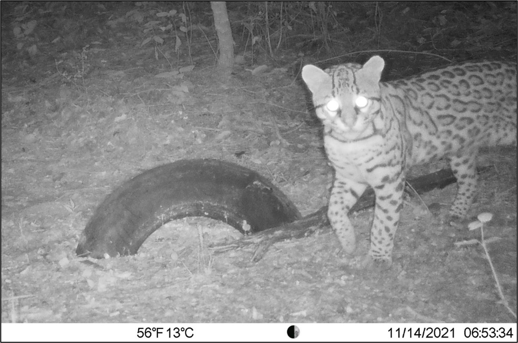 Velazco-Macías, C. G., & Peña-Mondragón, J. L. 2015. Nuevo registro de ocelote (Leopardus pardalis) en el estado de Nuevo León, México/New record of ocelot (Leopardus pardalis) in the state of Nuevo León, Mexico. ACTA ZOOLÓGICA MEXICANA (N.S.), 31(3), 470–472. https://doi.org/10.21829/azm.2015.3131089